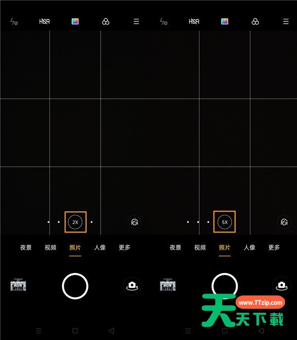 2、点击屏幕下方的1X处选择变焦倍数拍照,点选右侧的白点可以切换到2X、5X变焦倍数。