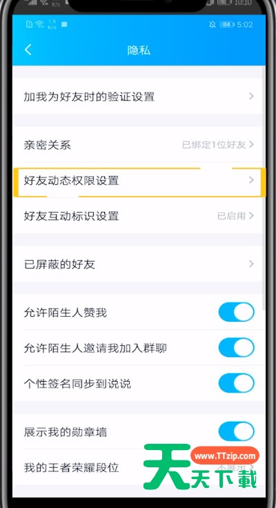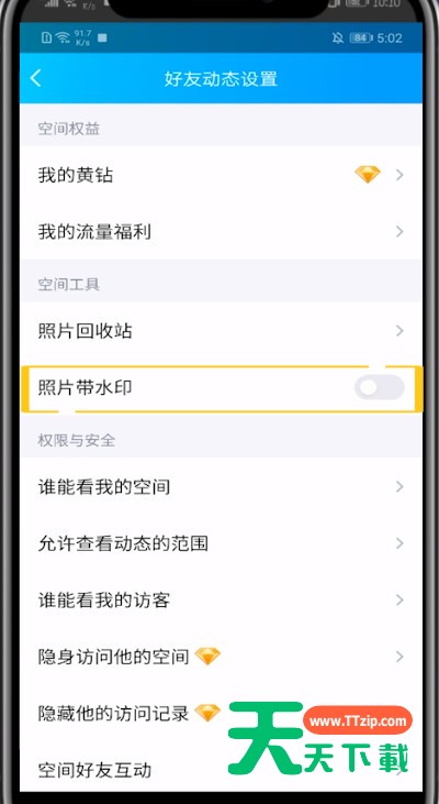 亲们想知道QQ空间照片怎么加水印的操作吗?下面就是天天下载整理的QQ空间照片加水印的基本方法,赶紧来看看吧,希望能帮助到大家哦! QQ空间照片加水印的基本方法 1、首先我们打开qq 2、点击左上角的个人头像 3、点击左下角的设置 4、点击隐私 5、点击好友动态权限设置 6、勾选照片带水印即可 以上就是天天下载为大家带来的QQ空间照片怎么加水印的操作方法,更多手机教程尽在天天下载! @天天下载 除特别注明外,本站所有文章均为 天天下载 原创,转载请注明出处来自 https://www.ttzip.com/48283.html