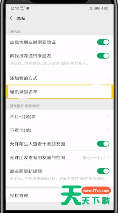 亲们或许不知道手机微信怎么看黑名单在哪里的详细操作,那么今天天天下载就讲解手机微信中看黑名单的方法教程哦,希望能够帮助到大家呢。 手机微信中看黑名单的方法教程 1、首先我们打开微信 2、点击右下角的我 3、点击设置 4、点击隐私 5、找到通讯录黑名单,点击进入即可查看黑名单 以上就是天天下载为大家带来的手机微信怎么看黑名单在哪里的操作方法,更多手机教程尽在天天下载! @天天下载 除特别注明外,本站所有文章均为 天天下载 原创,转载请注明出处来自 https://www.ttzip.com/48335.html