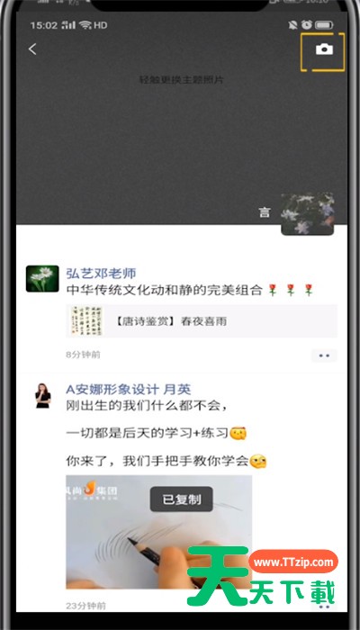 各位使用微信的同学们,你们知道复制后怎么粘贴吗?在这篇教程内天天下载就为各位呈现了微信复制后粘贴的方法教程方法。 微信复制后粘贴的方法教程 1、首先我们打开微信 2、点击发现 3、找到你要复制的朋友圈,长按文字点击复制 4、然后点击右上角的相机图标 5、点击文字框,点击复制即可 以上就是天天下载为大家带来的微信复制后怎么粘贴的操作方法,更多手机教程尽在天天下载! @天天下载 除特别注明外,本站所有文章均为 天天下载 原创,转载请注明出处来自 https://www.ttzip.com/48412.html