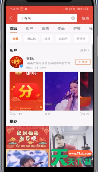 估计有的用户还不了解快手春晚红包怎么抢的操作,下文天天下载就分享快手抢春晚红包的方法步骤,希望对你们有所帮助哦。 快手抢春晚红包的方法步骤 1、首先我们打开快手 2、点击左上角的菜单栏 3、点击搜索 4、搜索春晚点击进入 5、点击亿字视频在春节联欢晚会期间上快手观看或点赞视频即可领取红包 以上就是天天下载为大家带来的快手春晚红包怎么抢的操作方法,更多手机教程尽在天天下载! @天天下载 除特别注明外,本站所有文章均为 天天下载 原创,转载请注明出处来自 https://www.ttzip.com/48443.html