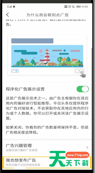在今日头条怎么打广告呢?下面就为大家分享今日头条中打广告的详细方法,有需要的可以来了解了解哦。 今日头条中打广告的详细方法 1、首先我们打开今日头条 2、点击右下角我的 3、点击系统设置 4、点击广告设置 5、点击我也想发布广告 6、点击立即预约咨询即可 7、编辑好您的身份信息后点击预约顾问咨询即会有广告专员跟您对接开通广告投放服务 以上就是天天下载为大家带来的今日头条怎么打广告的操作方法,更多手机教程尽在天天下载! @天天下载 除特别注明外,本站所有文章均为 天天下载 原创,转载请注明出处来自 https://www.ttzip.com/49581.html