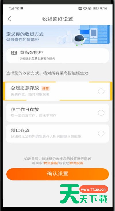 近日有一些小伙伴咨询天天下载关于在菜鸟裹裹如何设置自提柜呢?下面就为大家带来了在菜鸟裹裹中设置自提柜的方法,有需要的小伙伴可以来了解了解哦。 菜鸟裹裹中设置自提柜的方法 1、首先我们打开菜鸟裹裹 2、点击取件 3、点击右上角的菜单栏 4、点击菜鸟驿站服务设置 5、点击菜鸟智能柜 6、选择总是愿意存放后点击确认设置即可 以上就是天天下载为大家带来的菜鸟裹裹如何设置自提柜的操作方法,更多手机教程尽在天天下载! @天天下载 除特别注明外,本站所有文章均为 天天下载 原创,转载请注明出处来自 https://www.ttzip.com/49593.html