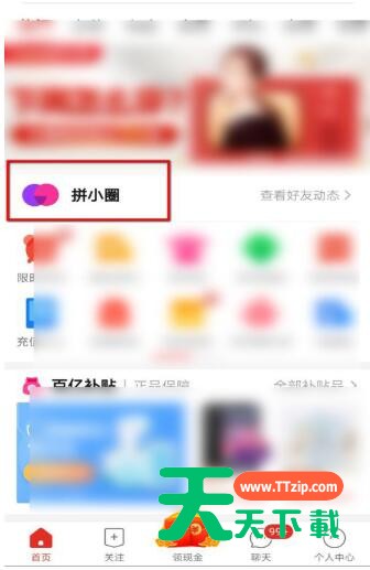 1、首先打开手机上的拼多多,点击首页上的拼小圈进入页面。