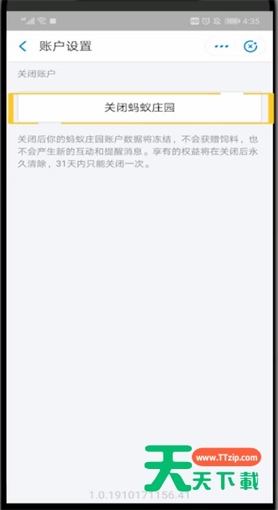 估计有的用户还不了解蚂蚁庄园怎么关闭,下文天天下载就分享蚂蚁庄园进行关闭的详细步骤,希望对你们有所帮助哦。 蚂蚁庄园进行关闭的详细步骤 1、首先我们打开支付宝 2、点击更多 3、点击蚂蚁庄园 4、点击右上角的菜单栏 5、点击设置 6、再次点击右上角的菜单栏 7、点击账户 8、点击关闭蚂蚁庄园即可 以上就是天天下载为大家带来的蚂蚁庄园怎么关闭的操作方法,更多手机教程尽在天天下载! @天天下载 除特别注明外,本站所有文章均为 天天下载 原创,转载请注明出处来自 https://www.ttzip.com/49888.html