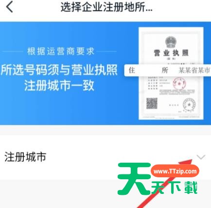 3、在打开的页面中,点击向下的箭头,选择企业注册地所在的城市。