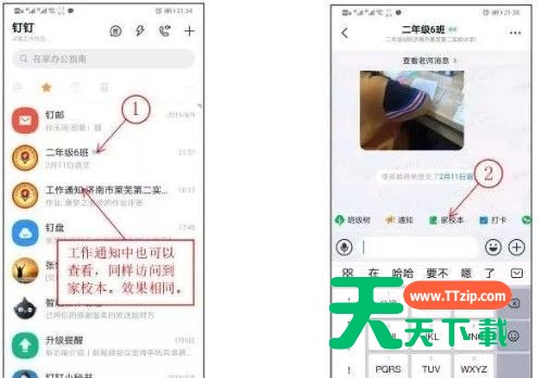 打开钉钉,进入班级群,点击家校本,可以看到老师布置的作业。在工作通知中也可以查看作业通知。