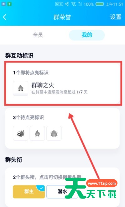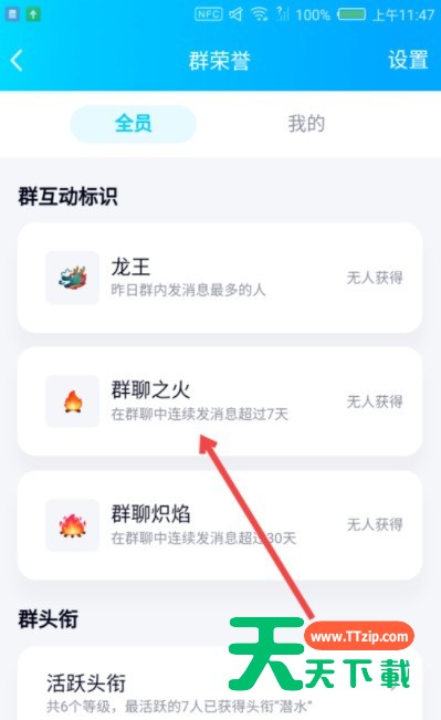 6、我们在这个群聊中连续发消息超过7天时,我们就可以获得群聊之火标识了。如图所示,我只需要再在这个群聊中发6天消息就可以获得群聊之火标识。