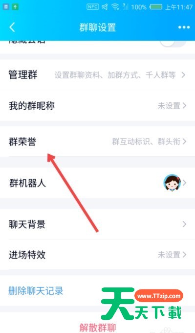 4、入到“群聊设置”界面,点击“群荣誉”。
