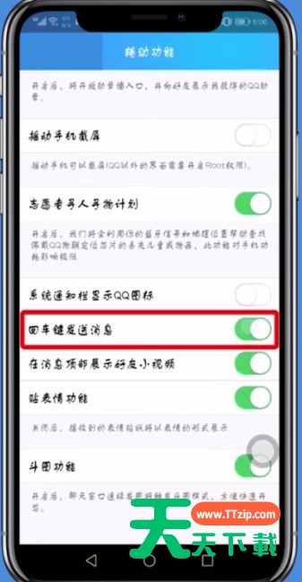 估计有的用户还不了解QQ怎么设置回车键发消息的操作,下文天天下载就分享QQ中设置回车键发消息的操作方法,希望对你们有所帮助哦。 QQ中设置回车键发消息的操作方法 1、首先在手机桌面点击进入QQ,点击左上角的头像, 2、点击左下角的【设置】, 3、点击打开【辅助功能】, 4、然后我们只要点击打开【回车键发送消息】开关即可。 以上就是天天下载为大家带来的QQ怎么设置回车键发消息操作方法,更多手机教程尽在天天下载! @天天下载 除特别注明外,本站所有文章均为 天天下载 原创,转载请注明出处来自 https://www.ttzip.com/50352.html