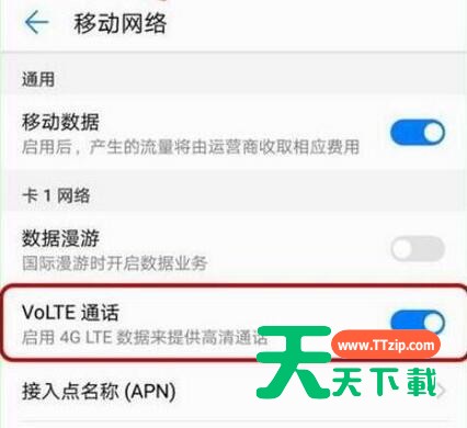 在移动网络页面,点击打开卡1或卡2下面的【VoLTE通话】的开关即可打开使用此功能,关闭开关即可关闭VoLTE。