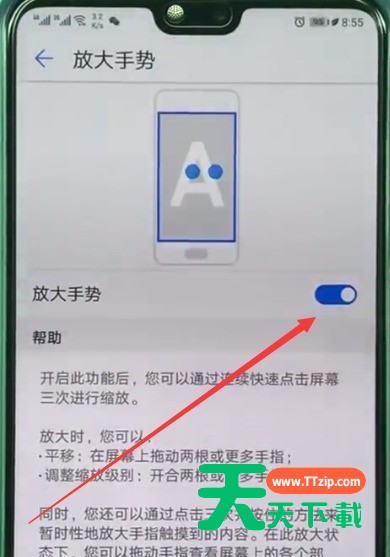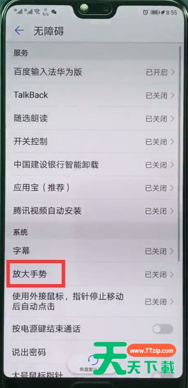 有那么一部份多小伙伴还不熟悉华为p20怎么开启放大手势的操作,下面天天下载就讲解华为p20中开启放大手势的详细步骤,希望对你们有所帮助哦。 华为p20中开启放大手势的详细步骤 1、点击进入桌面的【设置】, 2、找到【智能辅助】,点击打开【智能辅助】, 3、点击打开【无障碍】, 4、在这里可以看到【放大手势】,点击进入, 5、打开放大手势右侧的开关即可开启,如下图所示为打开状态。打开后我们只要点击屏幕三次即可放大屏幕,再次点击三次屏幕可以返回。 以上就是天天下载为大家带来华为p20怎么开启放大手势操作方法,更多手机教程尽在天天下载! @天天下载 除特别注明外,本站所有文章均为 天天下载 原创,转载请注明出处来自 https://www.ttzip.com/50369.html