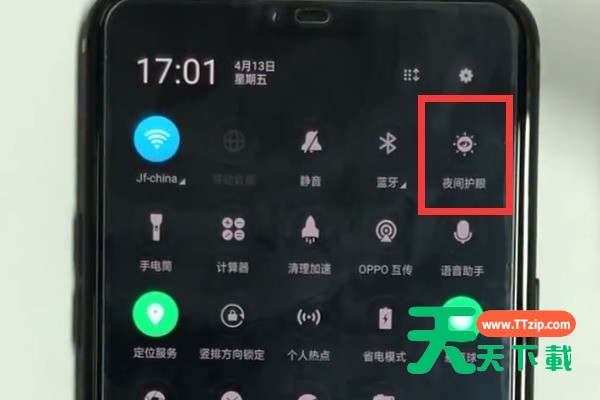 2、停留1秒钟,呼出控制中心,点击【夜间护眼】可开启护眼模式,长按【夜间护眼】图标还可以对护眼模式进行设置,