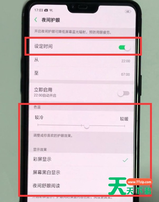 如下即是进入了夜间护眼设置界面,可以对开启时间、色温以及显示效果进行设置。