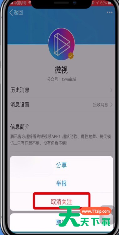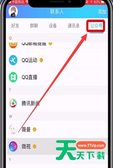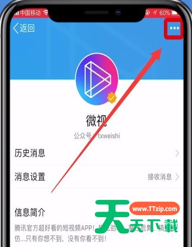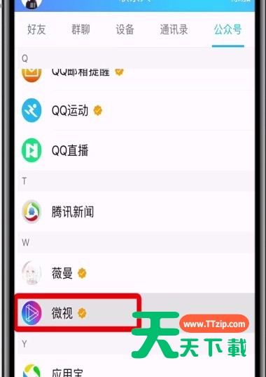 最近一些用户们在使用QQ的时候,不熟悉其中QQ里的微视怎么关闭?今日在这里就为你们带来了QQ关闭里的微视的简单步骤。 QQ关闭里的微视的简单步骤 1、点击进入QQ,点击【联系人】。 切换到联系人页面后,点击【公众号】, 2、在公众号列表中找到【微视】,点击进入。 3、进入如下页面后点击右上角的图标。 然后点击三个点的图标,如下, 4、点击【取消关注】即可。 以上就是天天下载为大家带来的QQ里的微视怎么关闭操作方法,更多手机教程尽在天天下载! @天天下载 除特别注明外,本站所有文章均为 天天下载 原创,转载请注明出处来自 https://www.ttzip.com/50815.html