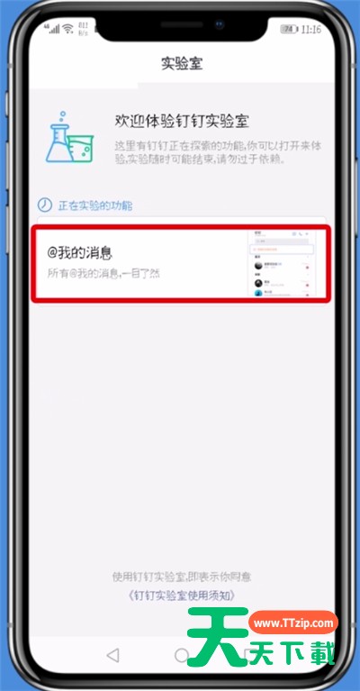 有很多小伙伴还不会使用钉钉置顶显示@我的消息,在此,下面天天下载就讲解了使用钉钉中置顶显示@我的消息的简单步骤,来下文看一看吧。 钉钉中置顶显示@我的消息的简单步骤 1、打开钉钉,点击“我的” 2、上滑屏幕,点击“设置” 3、点击“实验室” 4、打开“@我的消息” 5、“启用@我的消息”按钮即可 以上就是天天下载为大家带来的钉钉怎么置顶显示@我的消息操作方法,更多手机教程尽在天天下载! @天天下载 除特别注明外,本站所有文章均为 天天下载 原创,转载请注明出处来自 https://www.ttzip.com/51147.html