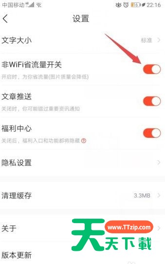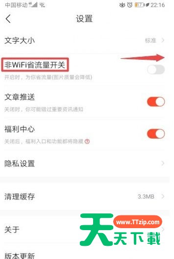 很多小伙伴还不熟悉看点快报省流量的操作,下面天天下载就讲解关于看点快报省流量的操作技巧,希望对你们有所帮助哦。 看点快报省流量的操作技巧 1、先打开手机,点击桌面上的看点快报。 2、然后点击我的。 3、之后点击设置。 4、然后将非WiFi省流量开关的滑动按钮向右滑动。 5、滑动完成后这样便开启了非WiFi省流量。 以上就讲解了看点快报省流量的操作技巧,希望有需要的小伙伴都来学习哦。 @天天下载 除特别注明外,本站所有文章均为 天天下载 原创,转载请注明出处来自 https://www.ttzip.com/51291.html