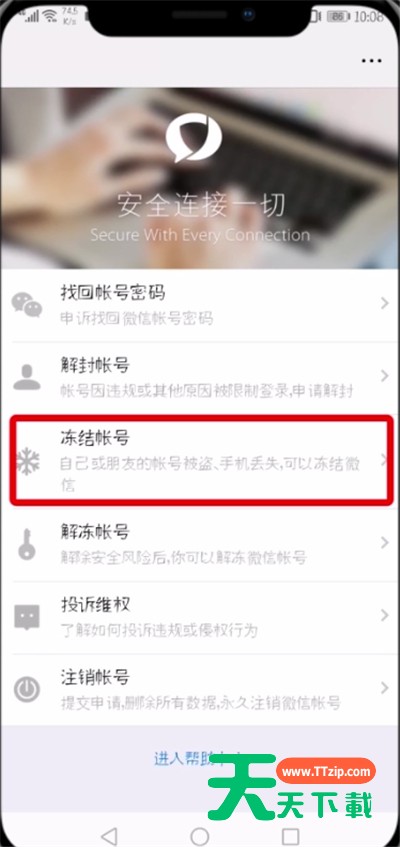 估计有的用户还不了解微信怎么冻结帐号的操作,下文天天下载就分享微信中冻结帐号的简单教程,希望对你们有所帮助哦。 微信中冻结帐号的简单教程 1、打开微信,点击“我” 2、点击“设置” 3、点击“账号与安全” 4、点击“微信安全中心” 5、点击“冻结帐号” 6、点击“开始冻结”即可 以上就是天天下载为大家带来的微信怎么冻结帐号操作方法,更多手机教程尽在天天下载! @天天下载 除特别注明外,本站所有文章均为 天天下载 原创,转载请注明出处来自 https://www.ttzip.com/51799.html