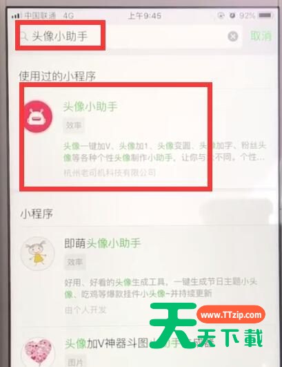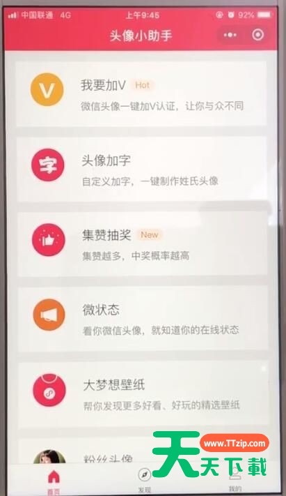 估计有的用户还不了解微信怎么制作个性头像的操作,下文天天下载就分享微信中制作个性头像的操作教程,希望对你们有所帮助哦。 微信中制作个性头像的操作教程 1、首先我们点击进入手机上的微信,点击屏幕下方的【发现】, 2、在发现的页面点击进入【小程序】, 3、然后我们点击顶部的搜索栏, 4、输入“头像小助手”,搜索并点击进入, 5、进入该小程序后,点击选择想要编辑的类型,以“我要加V”为例,点击【我要加V】, 6、添加完成之后,点击【保存】,然后我们再把这张图片设为头像即可。 以上就是天天下载为大家带来的微信怎么制作个性头像操作方法,更多手机教程尽在天天下载! @天天下载 除特别注明外,本站所有文章均为 天天下载 原创,转载请注明出处来自 https://www.ttzip.com/52153.html