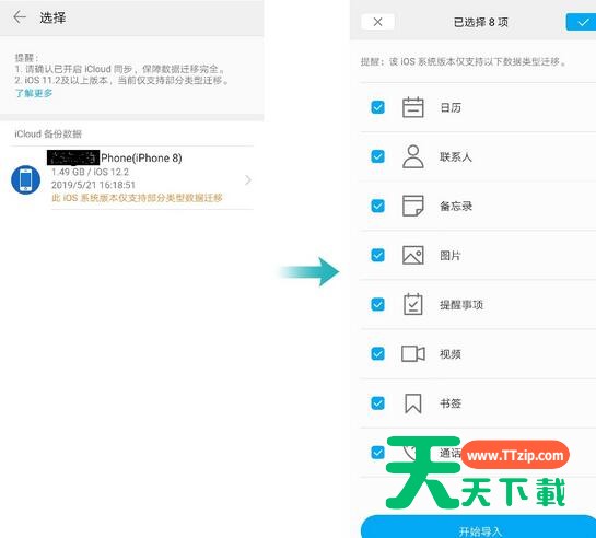 2、选中下图中【iCloud备份数据】中的设备,接着会跳出来下面的右图,挑选要备份的数据,备份完成后,点击【开始导入】,数据便开始下载。
