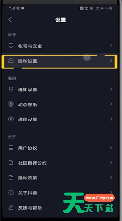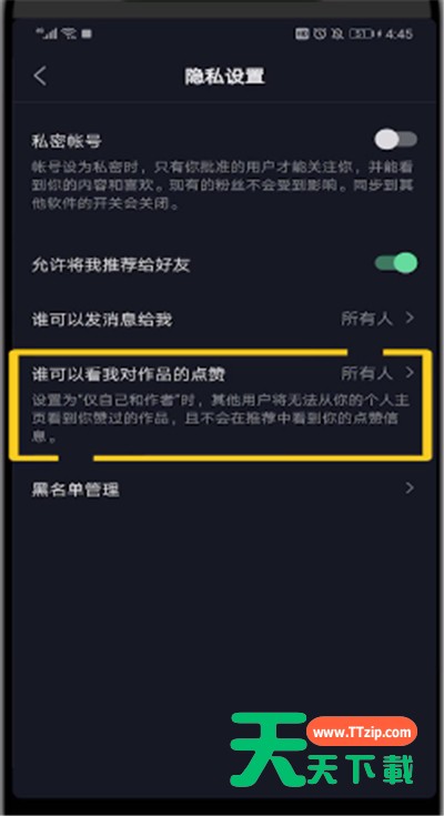 这期教程是为各位讲解在抖音中喜欢作品不让别人看到的操作教程,感兴趣的就赶紧去下文学习下吧,相信你们会喜欢。 抖音中喜欢作品不让别人看到的操作教程 1、首先我们打开抖音 2、点击右下角的我 3、点击右上角的菜单栏 4、点击设置 5、点击隐私设置 6、点击谁可以看我对作品的点赞 7、点击仅自己和作者 以上就是天天下载为大家带来的抖音喜欢的作品怎么不让别人看到的操作方法,更多手机教程尽在天天下载! @天天下载 除特别注明外,本站所有文章均为 天天下载 原创,转载请注明出处来自 https://www.ttzip.com/52948.html