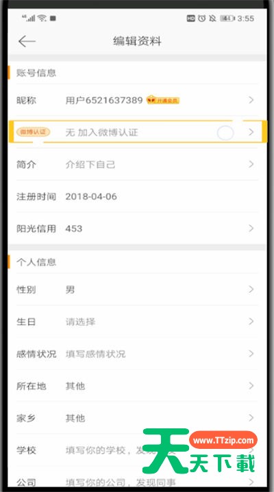 最近一些用户们在使用新浪微博的时候,不熟悉其中新浪微博V认证怎么弄?今日在这里就为你们带来了新浪微博使用V认证的操作方法。 新浪微博使用V认证的操作方法 1、首先我们打开新浪微博 2、点击右下角的我 3、点击左上角的个人头像 4、点击简介 5、点击右上角的编辑 6、点击微博认证即可 以上就是天天下载为大家带来的新浪微博V认证怎么弄的操作方法,更多手机教程尽在天天下载! @天天下载 除特别注明外,本站所有文章均为 天天下载 原创,转载请注明出处来自 https://www.ttzip.com/52984.html