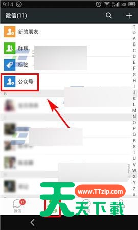 1)打开微信进入应用后点击下方【通讯录】,接着点击【公众号】,找到【微信运动】。点击进入公众号。(如下图)