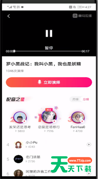 喜马拉雅怎么玩配音?,相信很多使用该软件的小伙伴们对此都很感兴趣,下面就和大家来分享一下,希望可以帮助到大家。 喜马拉雅中玩配音的简单操作介绍 1、首先我们打开喜马拉雅 2、点击右下角的账号 3、点击我要录音 4、点击趣配音 5、选择你要配音的片段,点击立即演绎 6、选择角色 7、点击下方的录音按钮即可开始录音,完成后点击上传即可 以上就是天天下载为大家带来的喜马拉雅怎么玩配音的操作方法,更多手机教程尽在天天下载! @天天下载 除特别注明外,本站所有文章均为 天天下载 原创,转载请注明出处来自 https://www.ttzip.com/53779.html
