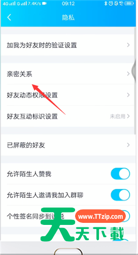 很多人在使用手机QQ的时候,不是很熟悉其中的亲密关系在什么位置?今天这篇教程中就为你们带来了手机QQ中找到亲密关系的详细操作步骤。 手机QQ中找到亲密关系的详细操作步骤 打开手机QQ,点击设置, 点击隐私, 点击亲密关系即可, 你也可以打开与好友的聊天对话框,点击他的头像, 点击设置, 即可看到亲密关系。 根据以上讲解的手机QQ中找到亲密关系的详细操作步骤,你们是不是都学会了呀! @天天下载 除特别注明外,本站所有文章均为 天天下载 原创,转载请注明出处来自 https://www.ttzip.com/53949.html