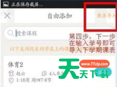 今天我们来学习一下课程格子中导入课表的具体方法步骤吧,有不清楚的小伙伴,一起来学习一下吧。 课程格子中导入课表的具体方法步骤 1、进入课程课子主页,会有一个学期或+的符号,你点击进去。 2、点击添加新学期后,就会获取最新的学期信息,点击设为当前学期。 3、点击添加课程,即成功设置为最新的学期。 4、点击教务导入后输入学号即可导入下学期课表。 好了,以上就是课程格子中导入课表的具体方法步骤,希望大家喜欢。 @天天下载 除特别注明外,本站所有文章均为 天天下载 原创,转载请注明出处来自 https://www.ttzip.com/54406.html