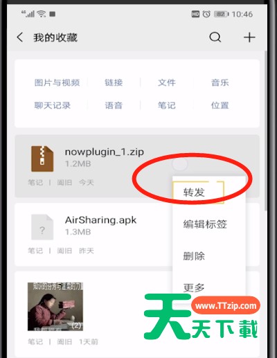 相信微信有很多人使用,这里主要说的是微信文件太大怎么发送?,希望可以帮到有需要的人。 微信文件太大发送的具体操作教程 1.打开微信,点击右下方的我 2.点击收藏,点击右上方的加号 3.点击下方的文件图标,选择要发送的文件 4.点击左上角的返回,长按笔记 5.点击转发,点击想发送的好友,点击发送即可 以上就是天天下载为大家带来的微信文件太大怎么发送操作方法,更多手机教程尽在天天下载! @天天下载 除特别注明外,本站所有文章均为 天天下载 原创,转载请注明出处来自 https://www.ttzip.com/54473.html