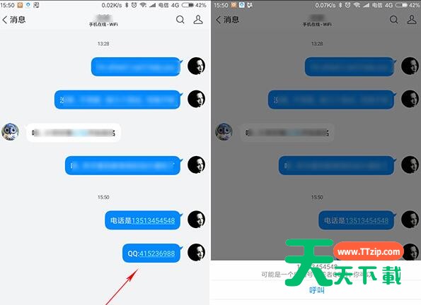 除了日期智能识别外,TIM的智能识别范围还包括Q号以及电话号码,只要你的聊天记录出现Q号或者电话一类的东东时。TIM就会智能标记出来,点击就能拨打了。