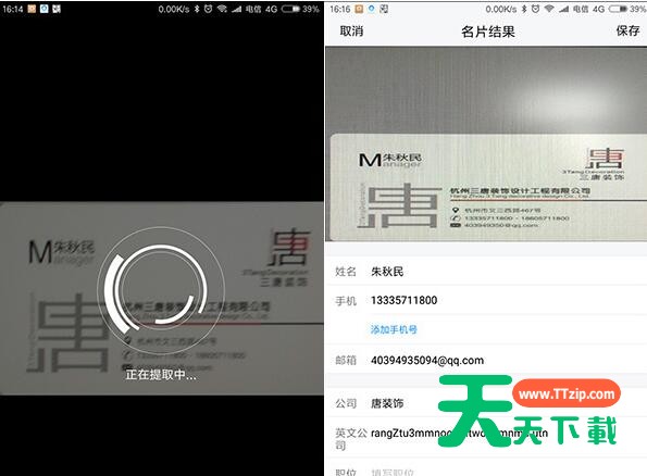 除了文档提取外,TIM的扫一扫也能将纸质名片一键变身电子名片。还是一样的操作,点击右上角“扫一扫”,切换到“名片”标签,然后对着名片扫描一下。TIM的识别能力很高,只要不是很粗糙的拍摄或者很怪异的排版,几乎都能轻松识别,很是好用。