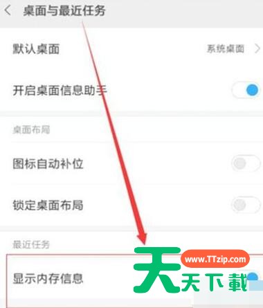 3、在桌面与最近任务界面,将下方【显示内存信息】开关打开,即可,