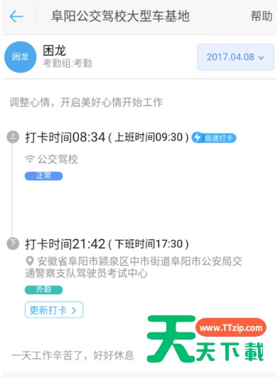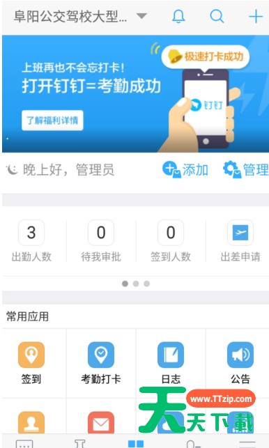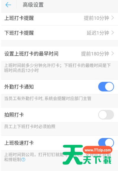有很多小伙伴还不会启用钉钉拍照打卡功能,所以下面天天下载就讲解了使用钉钉拍照打卡功能的操作过程,来下文看一看吧。启用钉钉拍照打卡功能的操作过程 打开钉钉APP,进入界面,点击中间的工作按钮,在弹出的页面中点击考勤打卡, 进入打卡界面,点击右下角的设置按钮, 在页面中选择高级设置, 进入高级设置页面,往下滑动鼠标,点击拍照打卡, 开启拍照打卡功能,点击保存,以后你就可以直接拍照打卡了。 以上就讲解了启用钉钉拍照打卡功能的操作过程,希望有需要的小伙伴都来学习哦。@天天下载 除特别注明外,本站所有文章均为 天天下载 原创,转载请注明出处来自 https://www.ttzip.com/55192.html