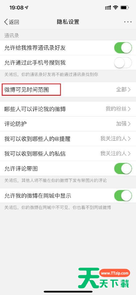 在微博APP中如何设置半年可见呢?下面就为大家带来了在微博APP中设置半年可见的图文教程,希望可以帮助到你哦。 在微博APP中设置半年可见的图文教程1、打开微博客户端-点击我-点击隐私设置; 2、点击微博可见时间范围; 3、选择最近半年(如果想要取消最近半年,就选择全部)。 以上就是在微博APP中设置半年可见的图文教程,你们明白了吗?@天天下载 除特别注明外,本站所有文章均为 天天下载 原创,转载请注明出处来自 https://www.ttzip.com/55656.html