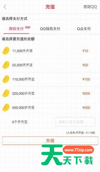 有的小伙伴使用齐齐互动视频还不会进行充值的操作,而本节就介绍了在齐齐互动视频里充值齐齐豆的操作过程,还不了解的小伙伴就跟着天天下载学习一下吧,希望对你们有所帮助。在齐齐互动视频里充值齐齐豆的操作过程 1、下载齐齐互动视频app,点击进入“我的”界面,点击“充值”。 2、选择要充值的金额,10元、50元等,获得一定数量的齐齐豆。PS:齐齐互动视频目前支持微信、QQ钱包、Q点三种支付方式。 以上这里为各位分享了在齐齐互动视频里充值齐齐豆的操作过程。有需要的小伙伴赶快来看看本篇文章吧。@天天下载 除特别注明外,本站所有文章均为 天天下载 原创,转载请注明出处来自 https://www.ttzip.com/56639.html