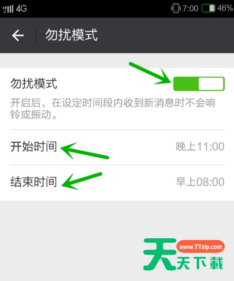4、勿扰模式光条变绿后,你就可以点击开始时间和结束时间进行设置了。