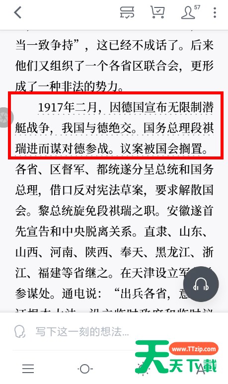 今天讲解的是微信读书APP取消划线的操作过程,想学习微信读书APP取消划线的操作步骤的,就去下文看一看,了解了解,相信对大家一定会有所帮助的。微信读书APP取消划线的操作过程 1、在阅读书籍的时候,默认会显示其他用户的划线部分(如下所示),有些小伙伴表示划线太过碍眼,而想要关闭划线的话,大家就需要进入阅读页面。 2、接下来在阅读页面的右上角点击按钮,唤起菜单列表找到“隐藏想法”功能,这样就能隐藏其他用户的划线。 3、若是想要取消自己设置的划线,大家就需要选中划线的部分内容,唤起列表点击“删除划线”按钮,非常方便快捷! 各位小伙伴们,看完上面的精彩内容,都清楚微信读书APP取消划线的操作过程了吧!@天天下载 除特别注明外,本站所有文章均为 天天下载 原创,转载请注明出处来自 https://www.ttzip.com/57571.html
