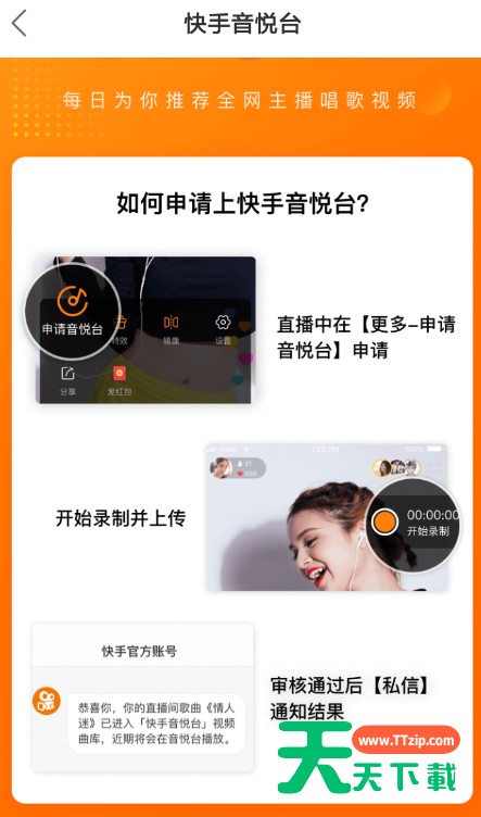 有很多小伙伴都喜欢玩快手这款APP,那么你们熟悉该应用里的音悦台玩法吗?今天最天天下载就分享了音悦台玩法操作,还不熟悉的小伙伴来下文看一看吧。快手里音悦台玩法讲解 1、对于快手音悦台感兴趣的用户,必须先进入“实验室”界面找到音悦台,通过右侧按钮启用快手音悦台,才能够体验这项服务。 2、进入同城页面即可找到快手音悦台,而这项功能会在每天为大家推荐唱歌好听的快手主播视频。 3、通过音悦台右侧的“更多歌曲”按钮,大家还可以查找更多的主播唱歌视频,适合喜欢听歌的小伙伴们! 4、若是用户想要申请音悦台权限,那就需要在直播的时候选择“更多”功能,找到“申请音悦台”功能录制唱歌视频即可。 还不熟悉快手里音悦台玩法的小伙伴们,不要错过天天下载带来的这篇文章哦。@天天下载 除特别注明外,本站所有文章均为 天天下载 原创,转载请注明出处来自 https://www.ttzip.com/57974.html