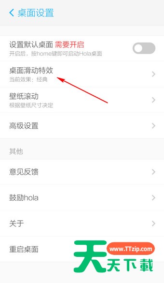 或许大家对Hola桌面这款APP是有一些了解的,但是大家知道Hola桌面设置扇形滑动的基础操作吗?今天天天下载就来分享Hola桌面设置扇形滑动的操作方法,大家可以去看一看哦。Hola桌面设置扇形滑动的基础操作 1、在Hola桌面下点击【桌面设置】图标 2、选择【桌面滑动特效】 3、即可选择其他的滑动特效,比如球、圆柱、贪吃蛇等,当然扇形也在其中 还不熟悉Hola桌面设置扇形滑动的基础操作的小伙伴们,不要错过天天下载带来的这篇文章哦。@天天下载 除特别注明外,本站所有文章均为 天天下载 原创,转载请注明出处来自 https://www.ttzip.com/58044.html