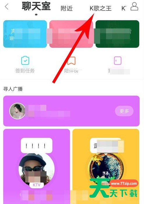 2、进入了聊天室界面之后,还需要选择页面上方的“K歌之王”功能,这样就能够加入或者创建k歌房间了。