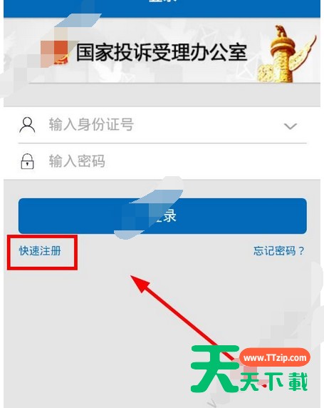 1、打开手机信访app,在“登录”页面的左下角就可以点击“快速注册”页面;