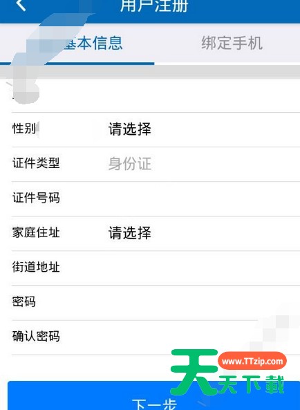 2、进入“用户注册”页面之后你需要填写基本信息,其中包括填写姓名、性别、证件类型、证件号码、家庭住址、街道住址,设置密码后点击“下一步”并绑定手机号就可以注册成功了哟!
