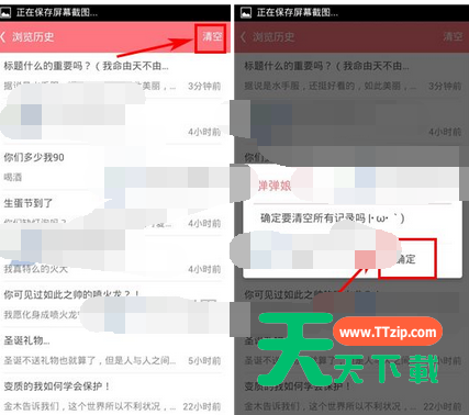 第一弹APP许多小伙伴都安装使用了,而今天笔者讲解的是第一弹APP将浏览历史清掉的简单操作,想学习第一弹APP将浏览历史清掉的操作方法的,就去下文看一看,了解了解,相信对大家一定会有所帮助的。 第一弹APP将浏览历史清掉的简单操作 1)打开第一弹,点击打开右下角的【我】,然后把屏幕向上拉取;(如下图) 2)点击下方的【设置】,接着点击下方的【浏览历史】;(如下图) 3)点击右上角的【清空】,然后点击【确定】即可。(如下图) 以上就讲解了第一弹APP将浏览历史清掉的简单操作过程,希望有需要的小伙伴都来学习哦。 @天天下载 除特别注明外,本站所有文章均为 天天下载 原创,转载请注明出处来自 https://www.ttzip.com/59460.html