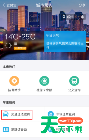 支付宝app是不少伙伴们都熟悉的,但大家或许不知道支付宝app缴纳交通违章罚款的相关操作,今天天天下载就讲解支付宝app缴纳交通违章罚款的操作方法哦,希望能够帮助到大家呢。
