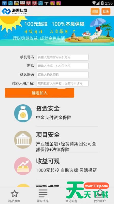 最近很多伙伴才接触海国在线APP,而对于海国在线APP注册账号的操作流程有许多同学问过,天天下载今天就带来海国在线APP注册账号的操作方法,一起好好学习下吧!海国在线APP注册账号的操作流程 1、打开海国在线APP,在右上角点击“注册”按钮; 2、然后在“注册”页面你需要输入自己的手机号、密码、推荐人用户名,然后点击“确认加入”就注册账号成功了哟! 上面就是天天下载为大家带来的海国在线APP注册账号的操作流程,一起来学习学习吧。相信是可以帮助到一些新用户的。@天天下载 除特别注明外,本站所有文章均为 天天下载 原创,转载请注明出处来自 https://www.ttzip.com/60374.html