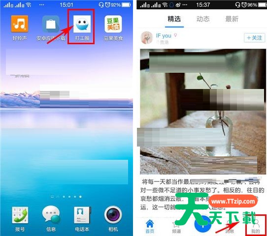 1)点击打开【打工圈】,点击右下角的【我的】;(如下图)