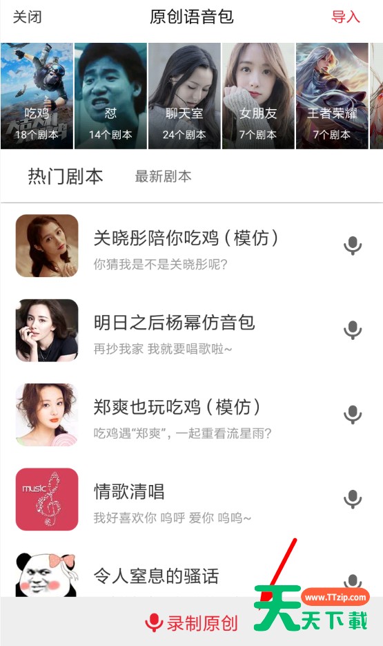 不少网友在使用很皮语音包APP时,会遇到一些问题,例如还不会录制语音的操作,下面天天下载就讲解很皮语音包APP录制语音的操作过程,希望可以帮助到你们。很皮语音包APP录制语音的操作过程 大家在使用很皮语音包的时候,如果想要进行语音的录制,那么就应该点击页面底端的“+”按钮,从菜单列表里选择“制作语音包”功能。 打开原创语音包的页面之后,再次点击底端的“录制原创”功能,进入到录音界面里进行设置。 这样一来,用户就可以点击麦克风按钮进行语音的录制了,录音的时长不得超过30秒。随后还需要填写标题概括语音的内容,才能够上传发布哦! 各位小伙伴们,看完上面的精彩内容,都清楚很皮语音包APP录制语音的操作过程了吧!@天天下载 除特别注明外,本站所有文章均为 天天下载 原创,转载请注明出处来自 https://www.ttzip.com/60996.html