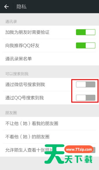 很多小伙伴都说在使用微信APP的过程里,还不会设置陌生人加不了,接下来天天下载分享微信APP设置陌生人加不了自己的详细操作。微信APP设置陌生人加不了自己的详细操作 1.进入微信,点击【我】 2.选择【设置】 3.找到【隐私】进入 4.点击【通过微信号搜索到我】、【通过QQ号搜索到我】后的按钮 5.按钮变为灰色表示关闭相关设置,这样陌生人就无法找到你了 各位小伙伴们,看完上面的精彩内容,都清楚微信APP设置陌生人加不了自己的详细操作了吧!@天天下载 除特别注明外,本站所有文章均为 天天下载 原创,转载请注明出处来自 https://www.ttzip.com/61441.html